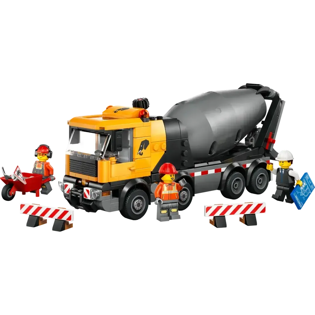 - LEGO® MINIFIGURE ACCESSORIES – This cement truck model comes with LEGO accessories including a wheelbarrow, road sign, 2 barriers, a clipboard, spade and broom