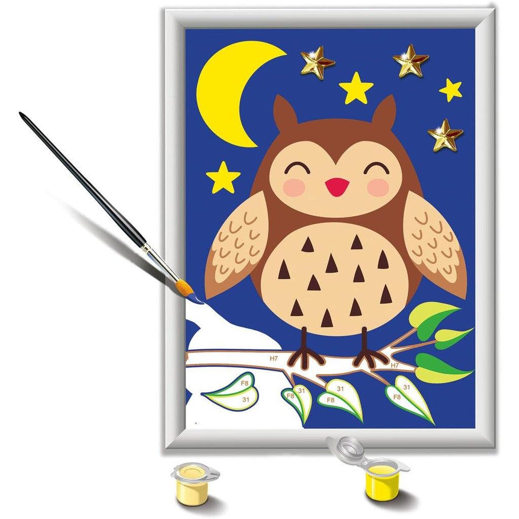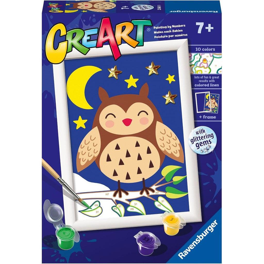 Make a wise move and give your child a fun and satisfying activity with Ravensburger's “Cute Owl” CreArt Painting by Numbers set, complete with sparkling gems!