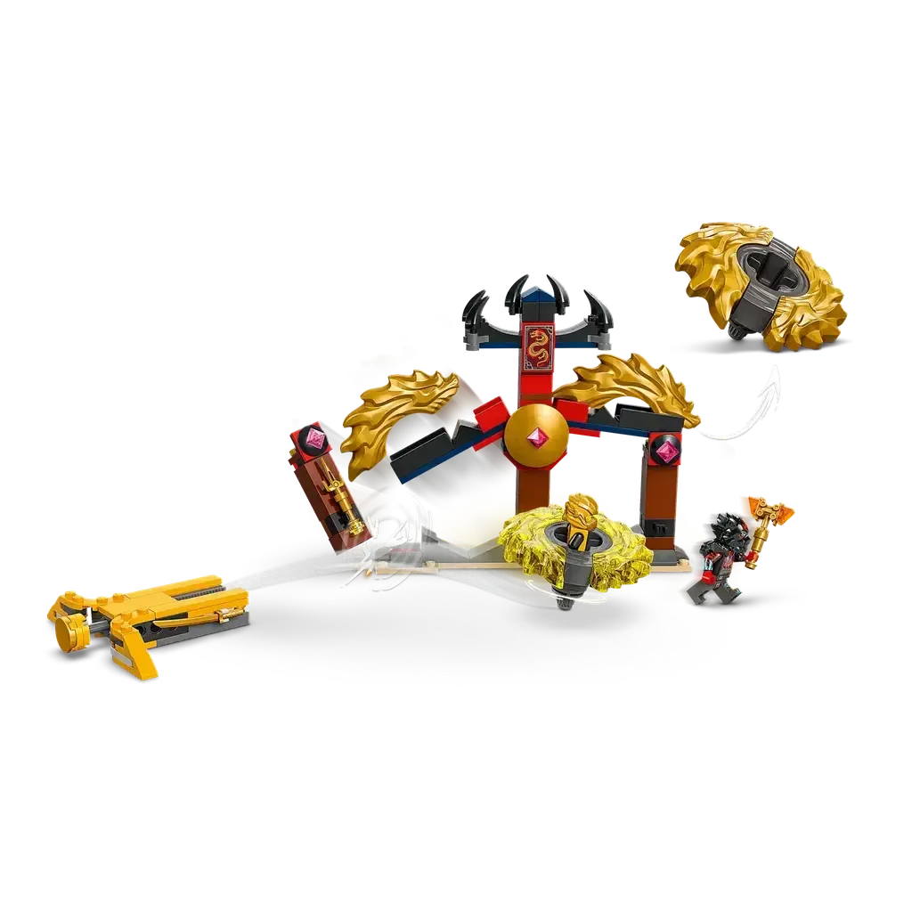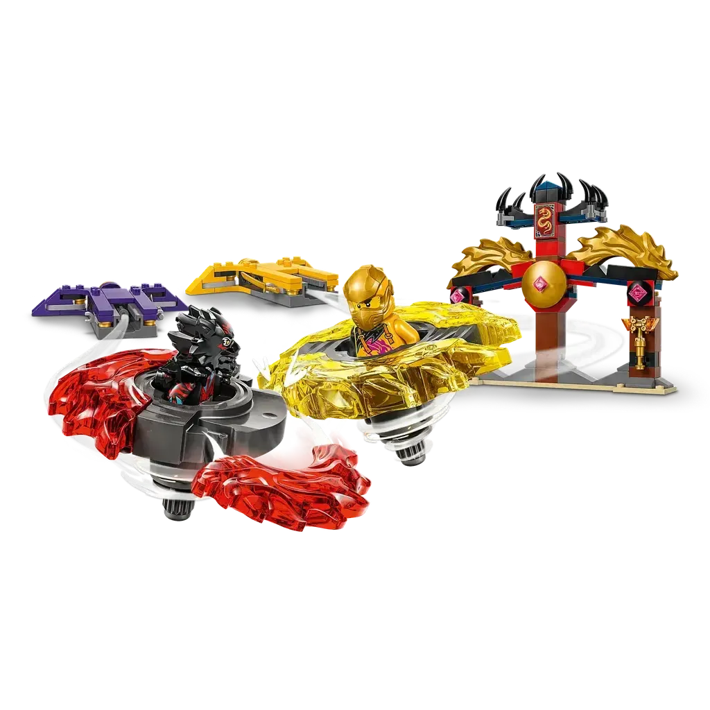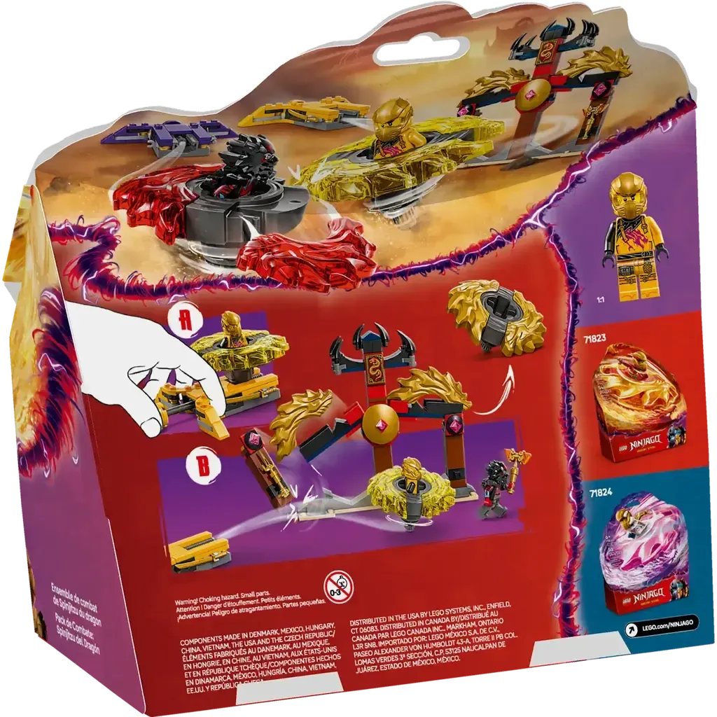The Dragon Spinjitzu Battle Pack (71826) action toy playset lets boys and girls aged 6 and up play out amazing action from season 3 of the NINJAGO® Dragons Rising TV show. This small LEGO® action toy set features a battle arena temple, 2 minifigures of Arin and Ras and 2 dragon spinjitzu spinner toys for kids to place into launchers and fire into spinning battles against each other.