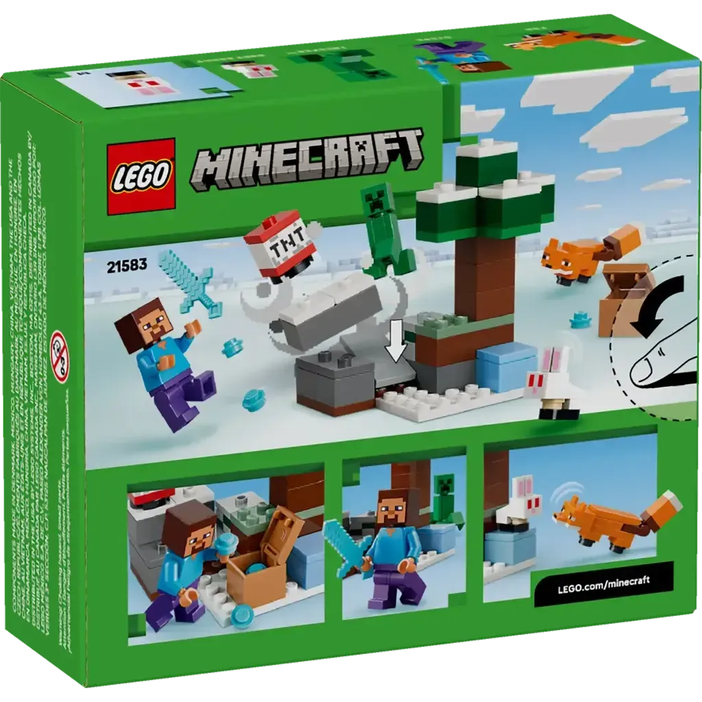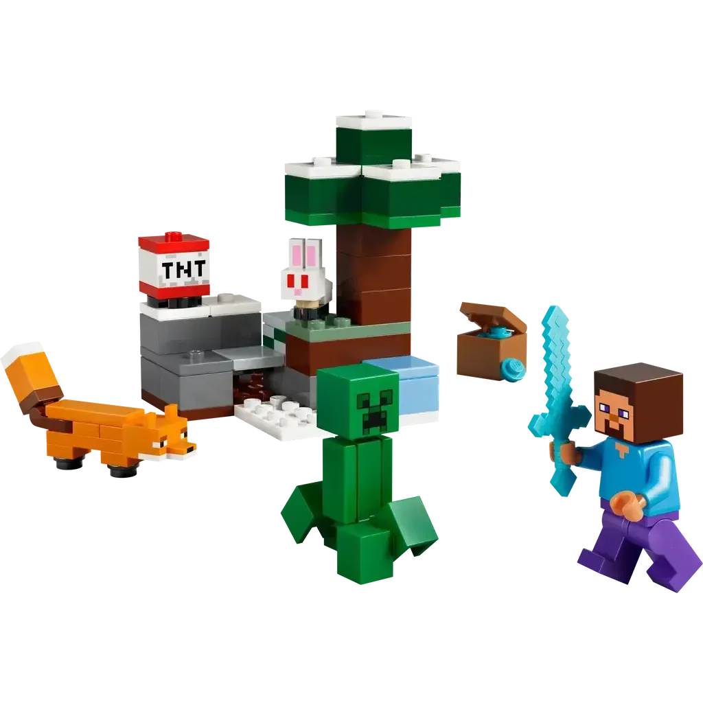 - 4 LEGO® MINECRAFT® CHARACTERS – Build adventures set in the taiga biome with a Steve minifigure, plus a Creeper™ and 2 Minecraft animal figures, a fox and a baby bunny