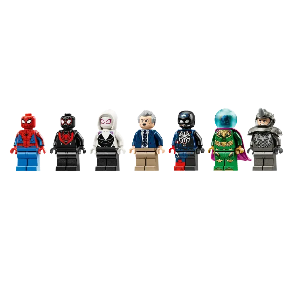 • 7 MINIFIGURES – Includes Spider-Man, Miles Morales, Ghost Spider, J. Jonah Jameson, Mysterio, Venomized Captain America and Rhino, plus a mech and 3 transparent posing sticks to enable mid-air action