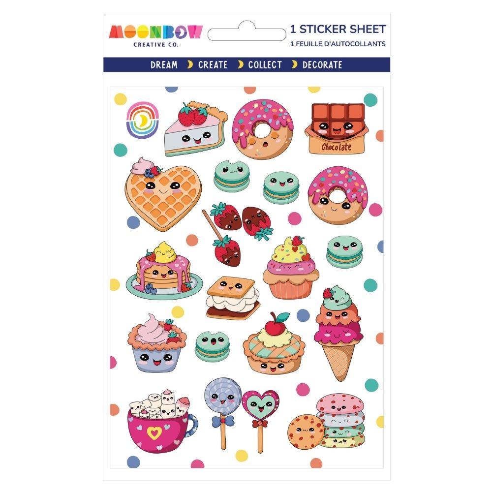 Sweeten up your day with this adorable sticker sheet featuring 18 cute and kawaii foods! From smiling ice cream and waffles to cheerful chocolate, pie, and cookies, these tasty treats are too cute to resist.