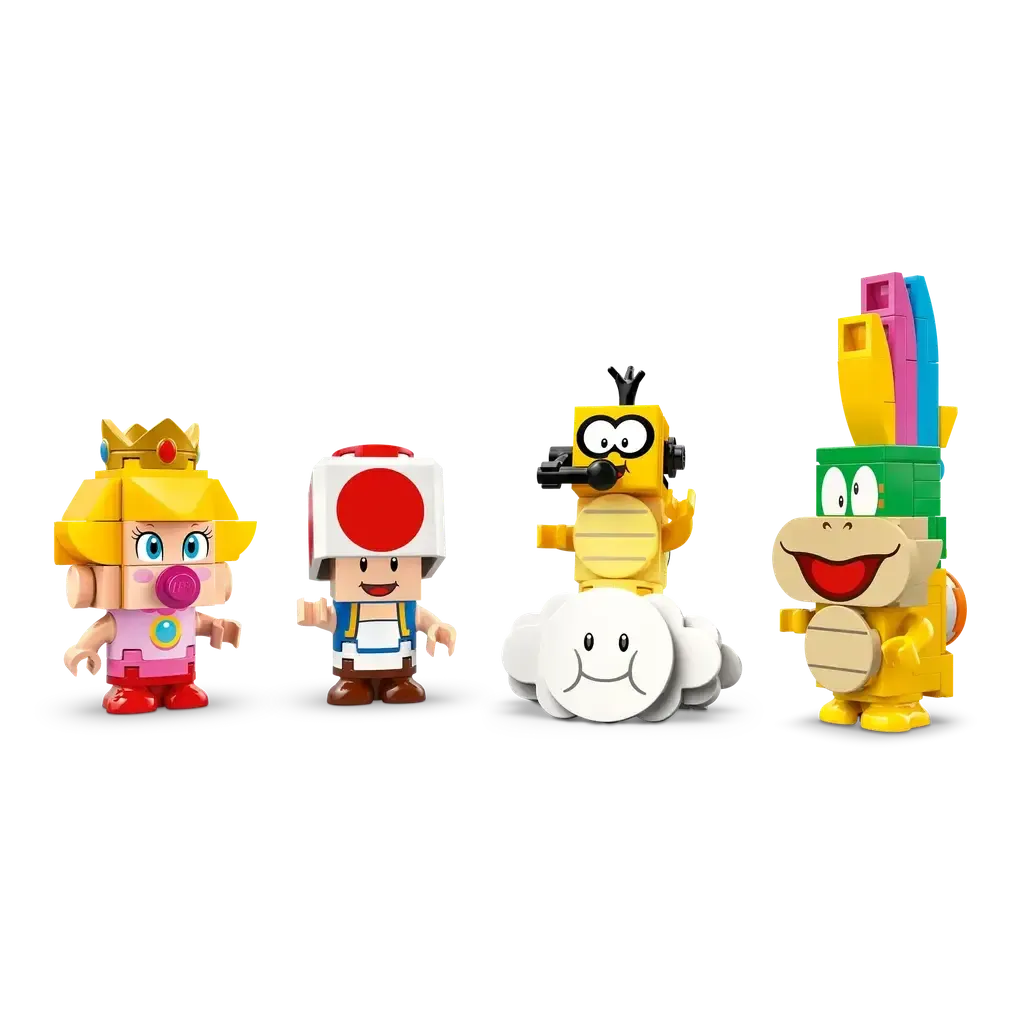 The set includes Baby Peach, Lakitu, Lemmy and Toad toy figures. Add a LEGO® Mario™, LEGO® Luigi™ or LEGO® Peach™ figure (from sets 71439, 71440 or 71441 – sold separately) for interactive play, including cool digital reactions when they drive the vehicles or are placed on the 2 Item Boxes or on the Action Tags of other builds.