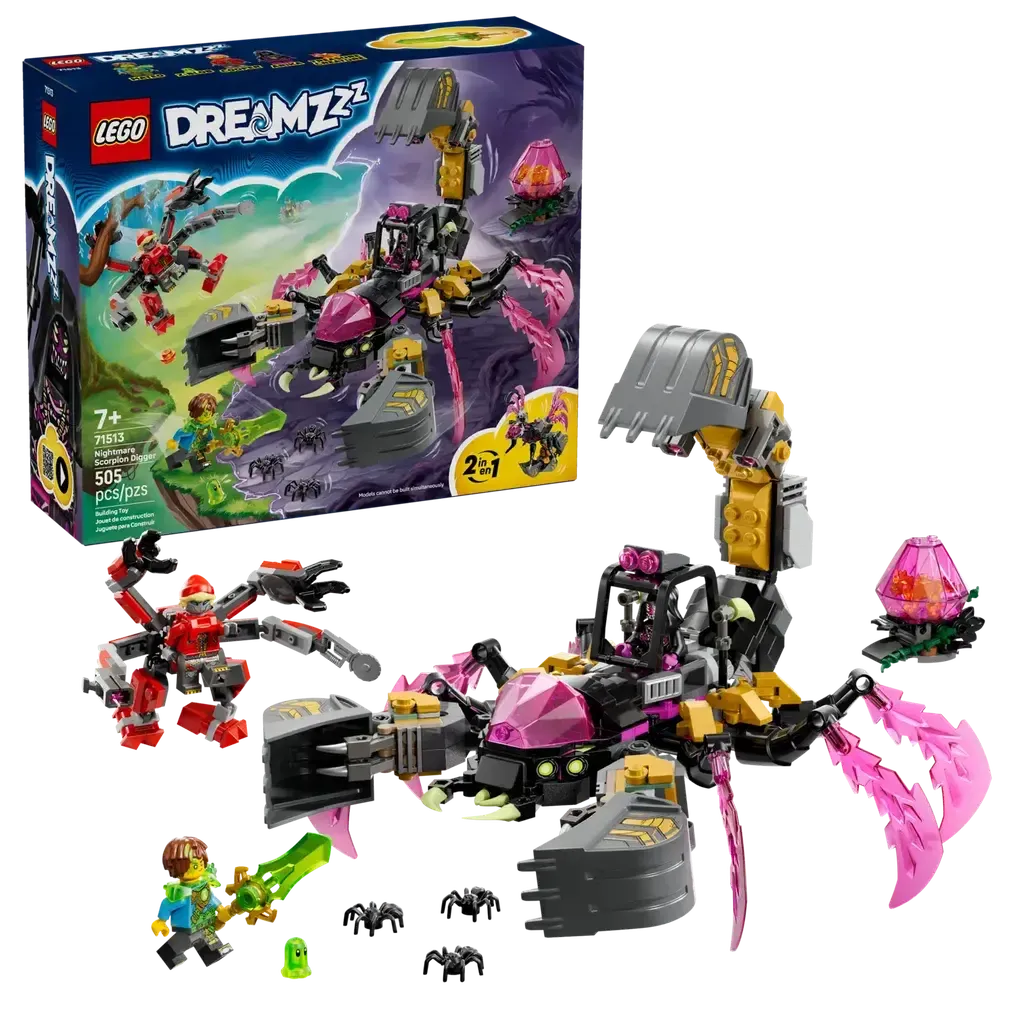 Fuel imaginations with this awesome LEGO® DREAMZzz™ Nightmare Scorpion Digger (71513) building set for boys and girls ages 7 and up. It offers 2 build options, so kids can create a scorpion excavator toy or a biomechanical wasp. The fantasy scorpion toy is a 6-legged terror equipped with clawed pincers, shooters and a crushing excavator, while the biomechanical wasp toy is a sleek winged predator with a venomous excavator stinger and shooters. The set also includes Mateo, Cooper and Arika minifigures to encourage pretend play, and Mateo comes with a collectible green sword accessory. There’s also a Z-Blob figure and 3 spiders, plus a pink diamond egg that’s been corrupted by the Nightmare Emperor and hatches a collectible Orange TreasureCreature toy. An action-packed birthday gift for kids, this building toy includes story-led building instructions that help dreamers immerse themselves in the action. These are also available digitally in the LEGO Builder app. Set contains 505 pieces.