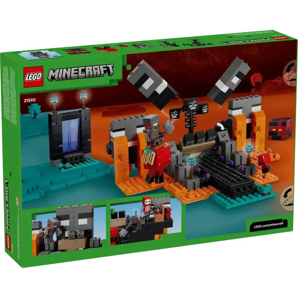 Transport Minecraft® players to endless pretend play possibilities with the Wither Battle (21590) building toy for boys and girls 8 years old and up. Kids join the Crimson Warrior as he takes on 2 skeletons and other mob figures in an explosive adventure in the warped forest biome. Packed with action and authentic Minecraft details, this set includes gaming characters like a Crimson Warrior, 2 wither skeletons, a strider, a magma cube and a buildable wither boss. A Nether portal and a shrine with a crafting table and a hidden wither that kids can summon with an explosion feature bring the game to life. Kids enjoy imaginative, hands-on play as they battle foes, ride the strider and engage in epic adventures – making it a great gamer gift for Minecraft players, LEGO builders and fans of video game toys. And friends and family can team up with Build Together mode in the LEGO Builder app, where everyone has fun building part of the set using their own devices. Set contains 494 pieces.
