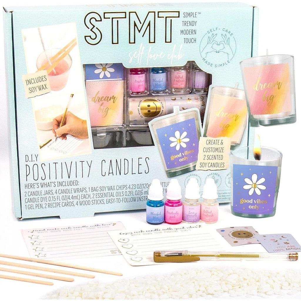 Create your own Positivity Candles with STMT and light up the good vibes! Complete with 2 glass candle jars, candle wraps, soy wax chips, coloring dye, fragrances, wicks, stickers, and more — this DIY candle-making kit has everything you need to create and customize 2 soothing soy candles.