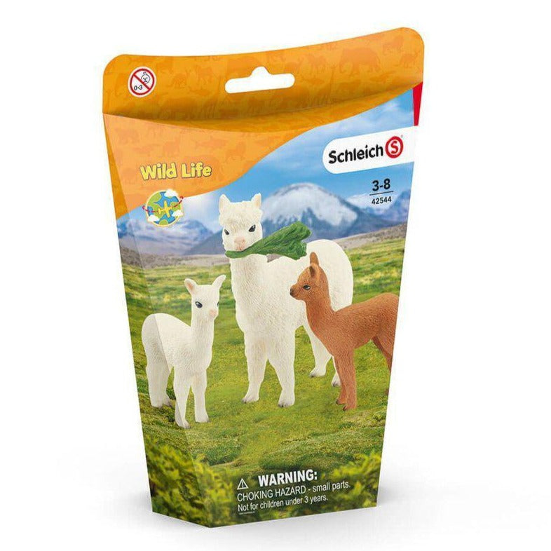 The Alpaca Set from Schleich® WILD LIFE includes one adult animal and two young. The animals in the Alpaca Set from Schleich® WILD LIFE come from the South American Andes, where they are bred for their soft, warm wool. They are hump-less camels with a calm and friendly temperament. The two young animals have different coats: One is white, the other brown. They are suckled by their mother for 6-8 months before starting to eat grass.