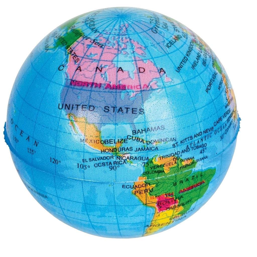 A world of bouncy fun and a stress relief! These unique squeeze balls feature a multi-color globe design, complimenting a spongy feel. Includes one Globe Stress Ball.