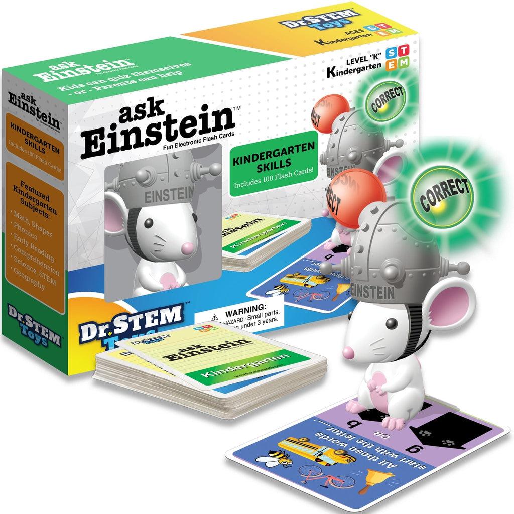 Ask Einstein is the newest technology in flash card learning. Kids will see a flash card and try and get the correct answer by placing Einstein on the card. If they are correct - Einstein flashes green and makes sounds. If the answer is wrong Einstein flashed red and buzzes. This kit includes the Ask Einstein character and 100 flash cards cover basic Kindergarten skills every child needs. Plus, we've included 5 different games kids can use to challenge their knowledge: