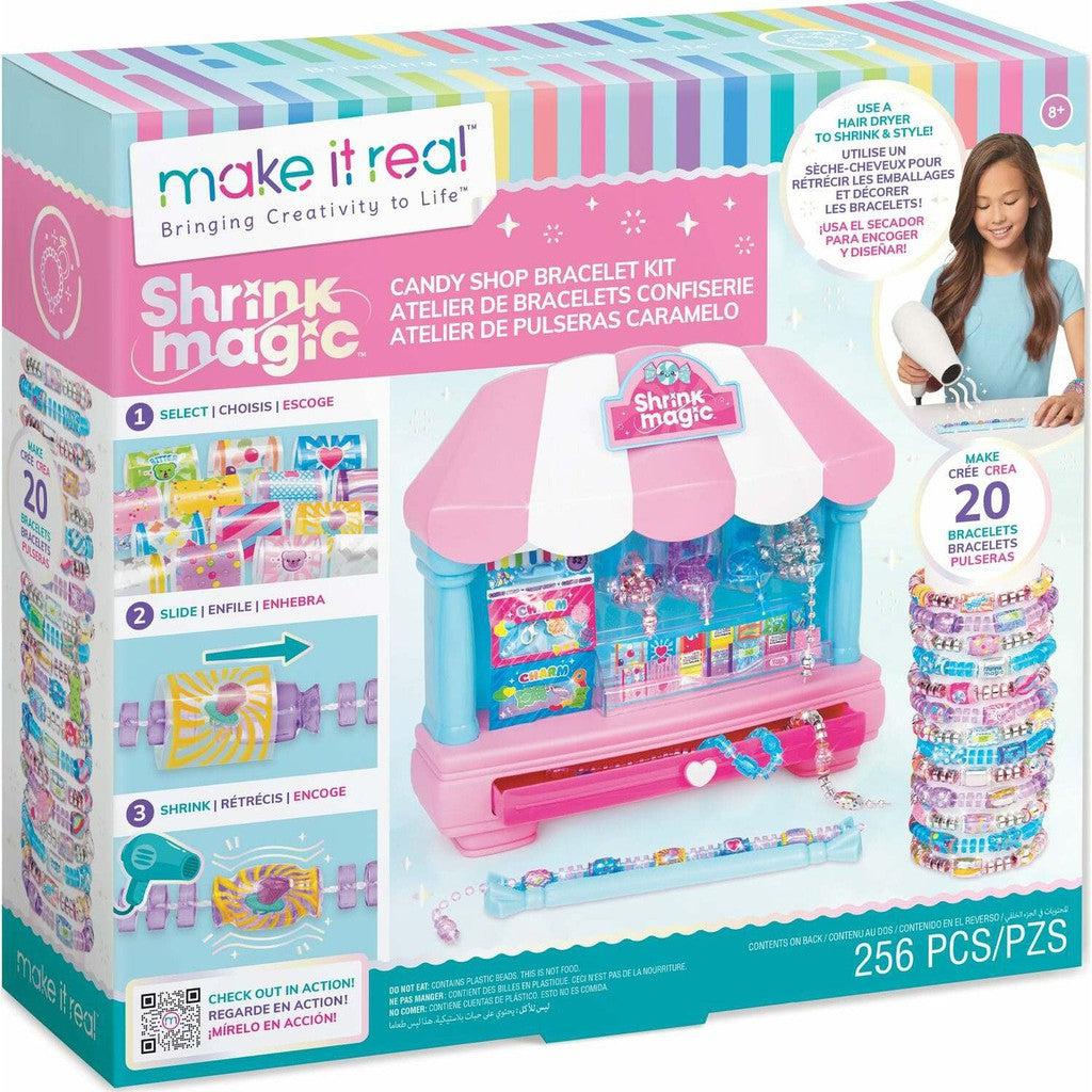 The Shrink Magic Candy Shop is where treats are made to wear, and the magic is in the shrink! Select, slide, and shrink the wrappers to create these sweet and colorful accessories! Select a bead strand then choose candy design wrappers and align on the beads. Easily apply heat with a hair dryer (not included) and watch the magic happen!