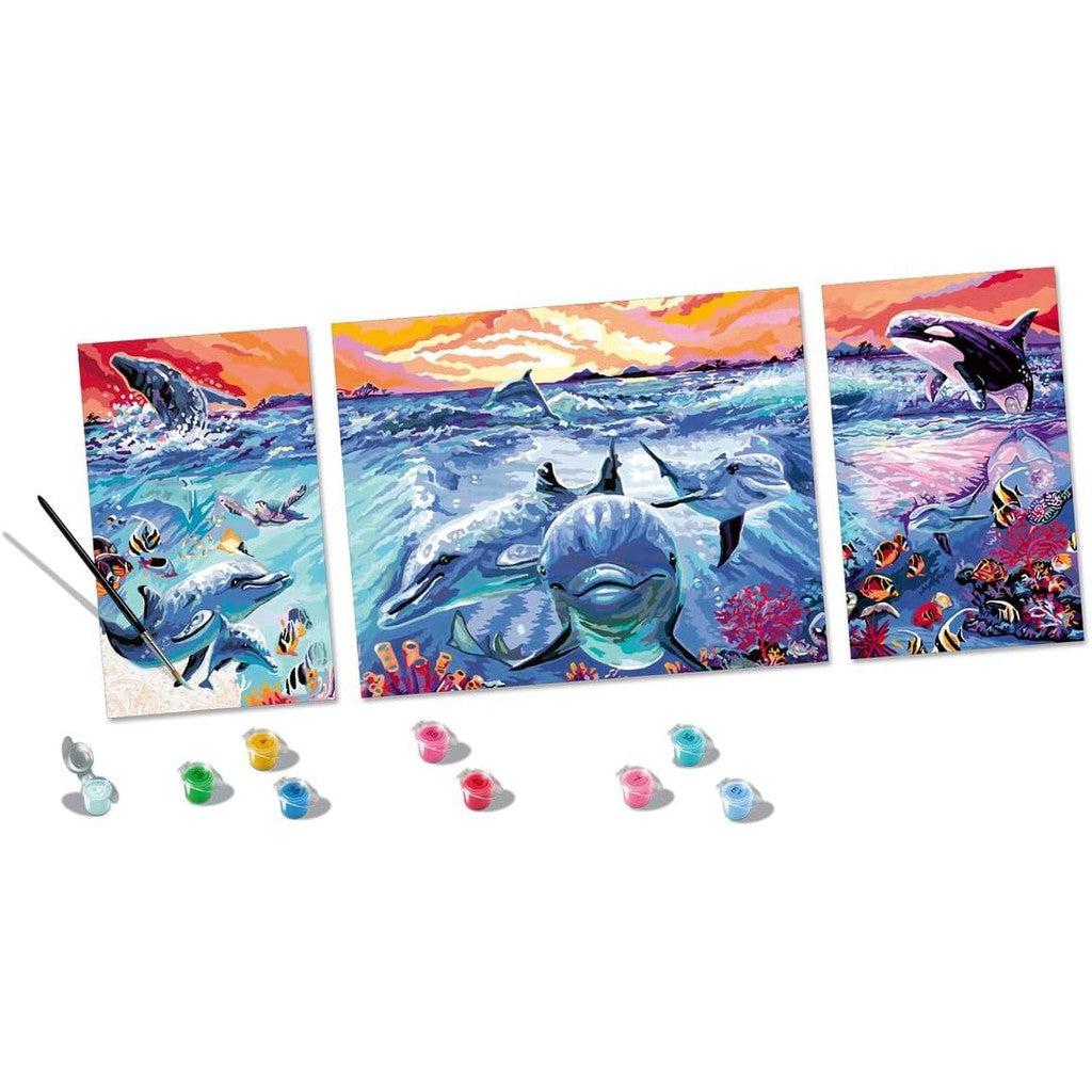 Dip your toe into creating your very own stunning artwork with Ravensburger's “Dolphins at Sunset” triptych CreArt Painting by Numbers set!