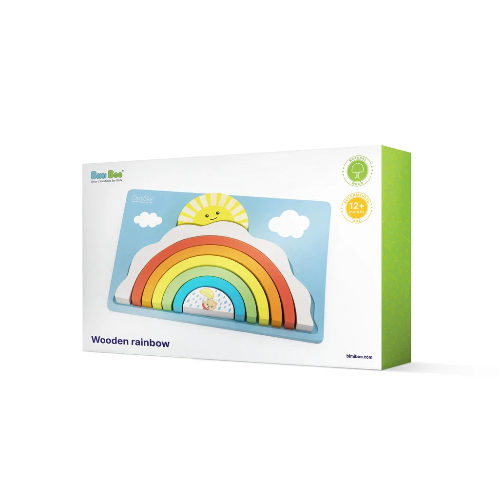 The Rainbow Stacker has 5 different colored arcs, clouds, and sun on the sky board and Bimi Boo that can be stacked on top of each other.