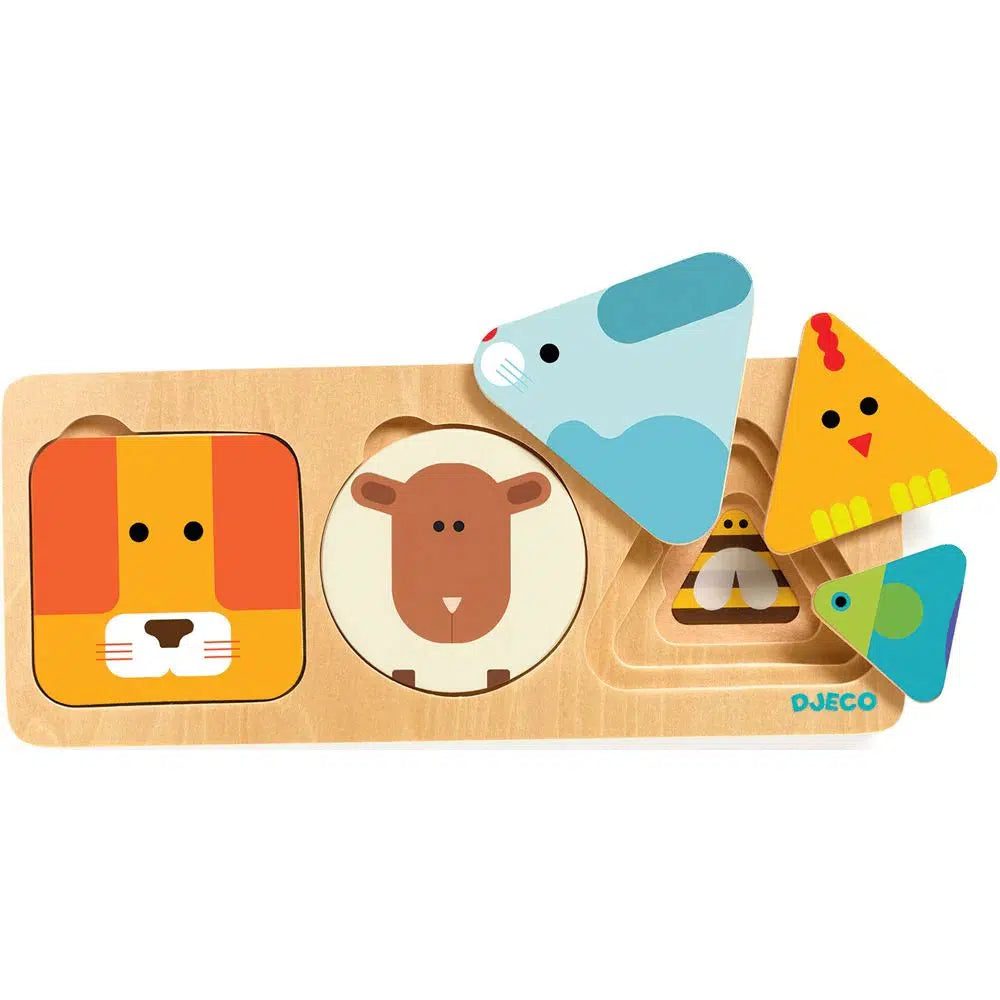 A unique wood puzzle with various shapes and levels; Can you find the animals hidden underneath? Find the animals under the squares, circles and triangles and put them back in the right order. Helps develop motor skills, shape identification, sequencing, linear thinking and early word identification.