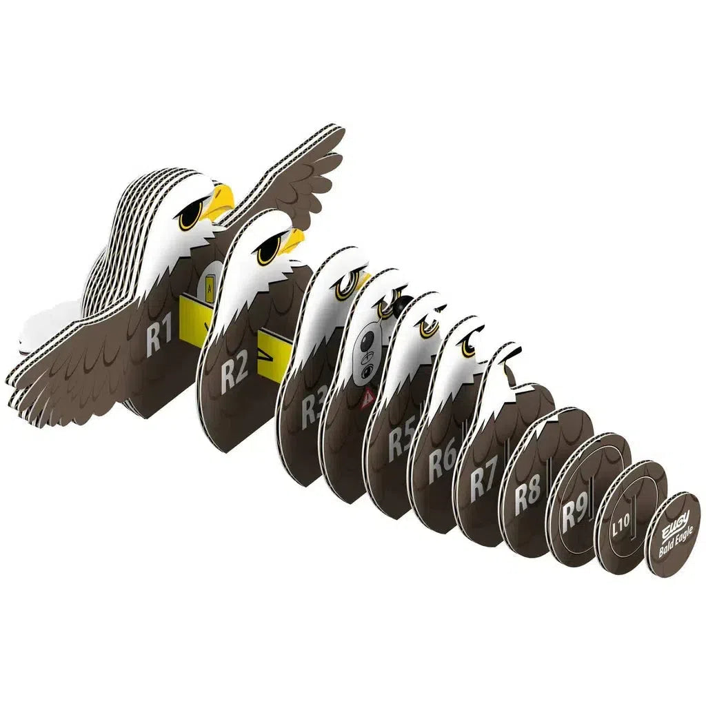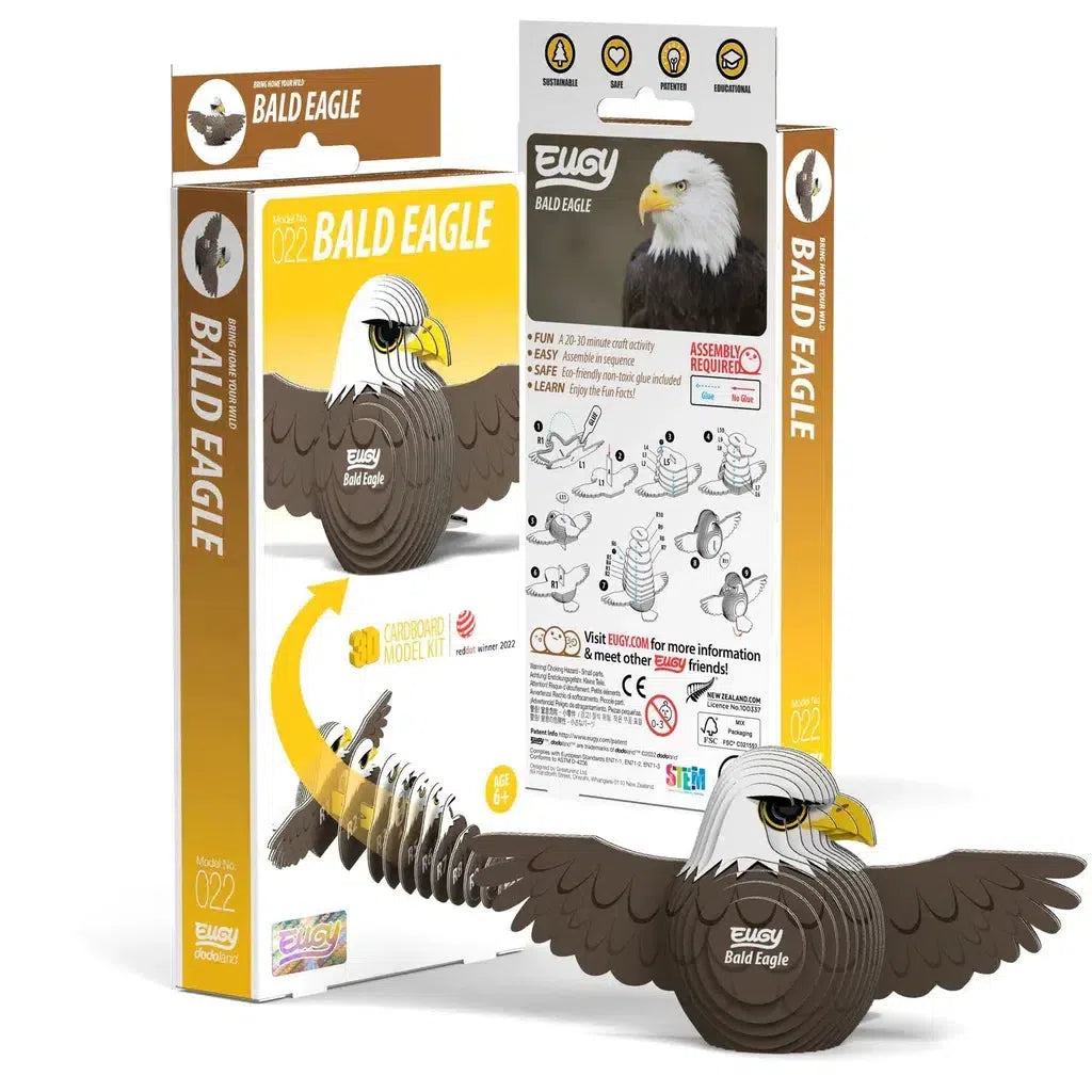 EUGY - a super-fun 3D puzzle that's eco-friendly and can be assembled in 10 to 20 minutes! Assemble this proud Bald Eagle puzzle and experience the magic of EUGY! This collectable toy is great for STEM concepts and craftable fun. It's sure to delight kids and adults alike! There are over 90 designs and counting for you to collect and enjoy!