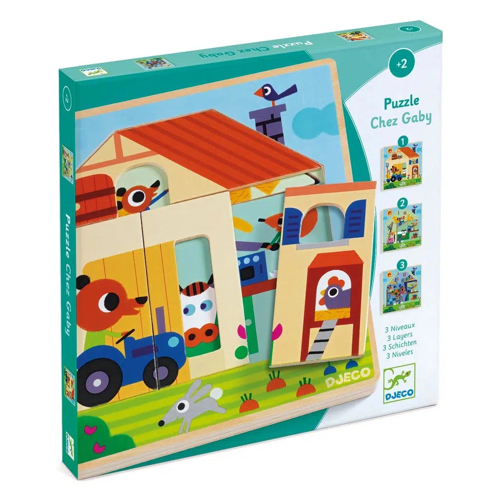 Who's in the barn? A unique, three-layered wooden puzzle with a cute barn motif to build again and again!