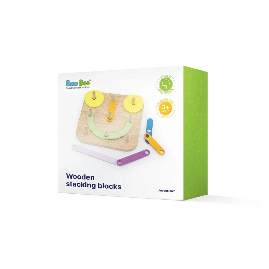 Bimi Boo Stacking Blocks come with a pegboard, assembling tips, and 28 blocks in 6 different colors: green, blue, red, purple, orange, and yellow.