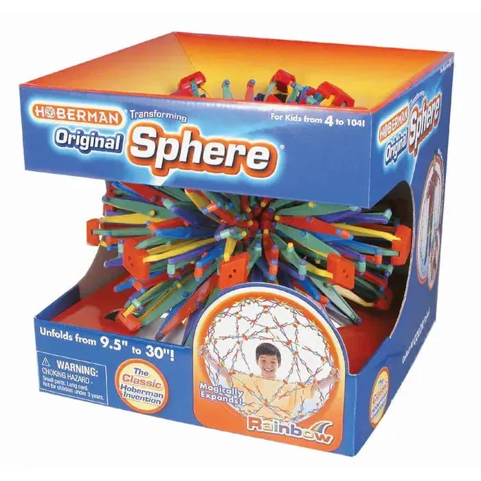 Prepare to be mesmerized by the Hoberman Original Sphere, a magical toy that expands from 9.5 inches to an impressive 30 inches. This sphere is perfect for solo play and educational exploration, offering both fun and learning in one package. It includes a pulley system and hardware, making it easy to set up as a captivating kinetic mobile. An educational booklet and a 'Cool Things to Do' activity sheet are also included, providing engaging ways to learn and interact with the sphere.