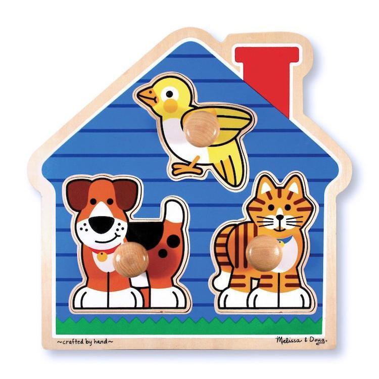 Three favorite pets live in this cozy blue house and are always ready for puzzle play. This extra-thick wooden puzzle includes three big puzzle pieces with jumbo wooden knobs for easy grasping. Full-color, matching pictures appear underneath each piece. A great activity to encourage hand-eye coordination and visual perception skills.