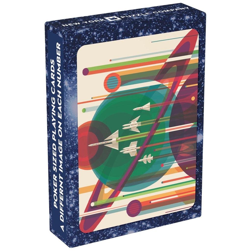 Explore every corner of the universe in this space themed playing card deck featuring the vintage-inspired posters from NASA's "Visions of the Future" illustration series. From Jupiter to Venus and Exoplanets to Planetary Moons, leave no stone unturned in the quest for space travel. Poker-sized playing cards feature a different poster on each number for a total of 13 different images in each deck. Made in the USA. Casino-quality construction.