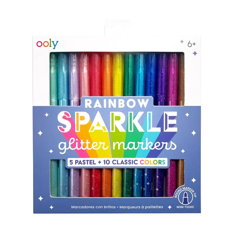 Make your own sparkly fun with this shimmering set of 15 Rainbow Sparkle Glitter Markers. This set of rainbow markers comes with 10 classic colors and 5 pastels colors so you’ll have plenty of colors to make wonderful works of art.