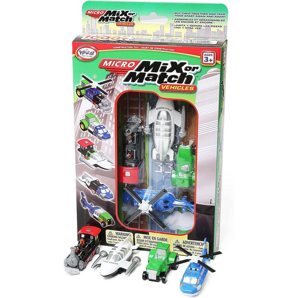 Even the smallest of toys can fuel one’s imagination. This 9 piece set of MICRO Mix or Match Vehicles allows you to build three familiar vehicles, or to mix up the pieces and build three vehicles you’ll never see on a road! Each pocket-sized 3-piece vehicle is 2.5 to 3.5 inches long and together can be combined 1000’s of different ways! Ever see a vehicle that can hall dirt to the moon and return home for a safe water landing? If you can think it, you can build it with MICRO Mix or Match Vehicles!