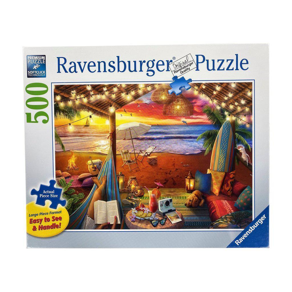 We enjoy the Ravensburger large piece puzzles, easier to see and handle the pieces. This one is a "just right" puzzle in the 500 piece format. It is also very colorful and a pleasant scene.