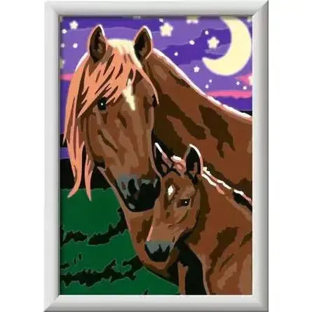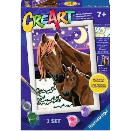 Watch your child’s face glow with pride as they complete this charming glow-in-the-dark “Horses at Midnight” CreArt Painting by Numbers set!