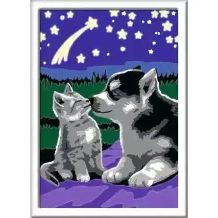 Make playtime as heartwarming as this adorable kitten and puppy with this glow-in-the-dark “Moonlight Friends” CreArt Painting by Numbers set!