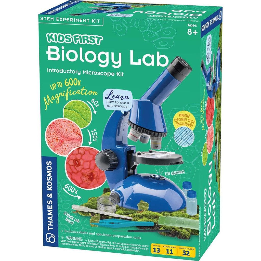 Discover the science of living things with this complete introductory microscope kit. The beautifully illustrated experiment manual guides you through observations of many living specimens found in and around your home: onion cells, pond water, chloroplasts, plant stem cross sections, microorganisms, mouth cells, meat cells, different types of hair and fur, dust mites, bugs, pollen in honey, and much more. See how an onion cell shrivels and how a paramecium wiggles. Analyze the differences between the hair on your head and the sheep’s hair in your wool sweater. The kit includes slides, cover slips, and many helpful tools. Learn how to use these tools to prepare slides and how to use the microscope to examine them. Investigate how the lenses in a microscope bend light to magnify images. When the ocular lens, or eyepiece lens, works together with the three objective lenses, the result is a total magnification power of 60x, 150x, or 600x. The microscope has a battery-powered light to light up the specimens. The full-color, 32-page manual covers microscope setup, usage, and many fascinating observations of biological specimens.