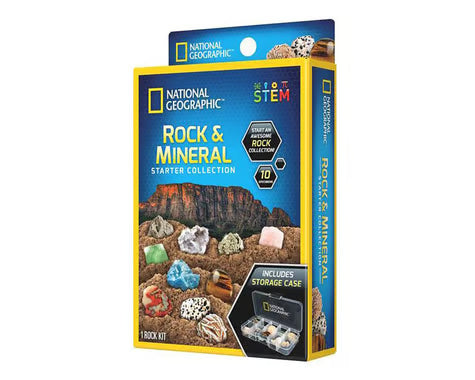 Looking to introduce elementary children to the fun of rock collecting? Check out this great starter set of popular rocks, that includes a clear storage case and identification sheet. Ten specimens, each measuring approx. ½” - ¾” long, include tiger’s eye, geode, pyrite, rose quartz, green fluorite, agate, desert rose, blue calcite, pumice and dalmatian jasper. Storage case measures 5” x 2 ½” and has the National Geographic logo on top. Great stocking stuffer or simply as a reward for a job well done!