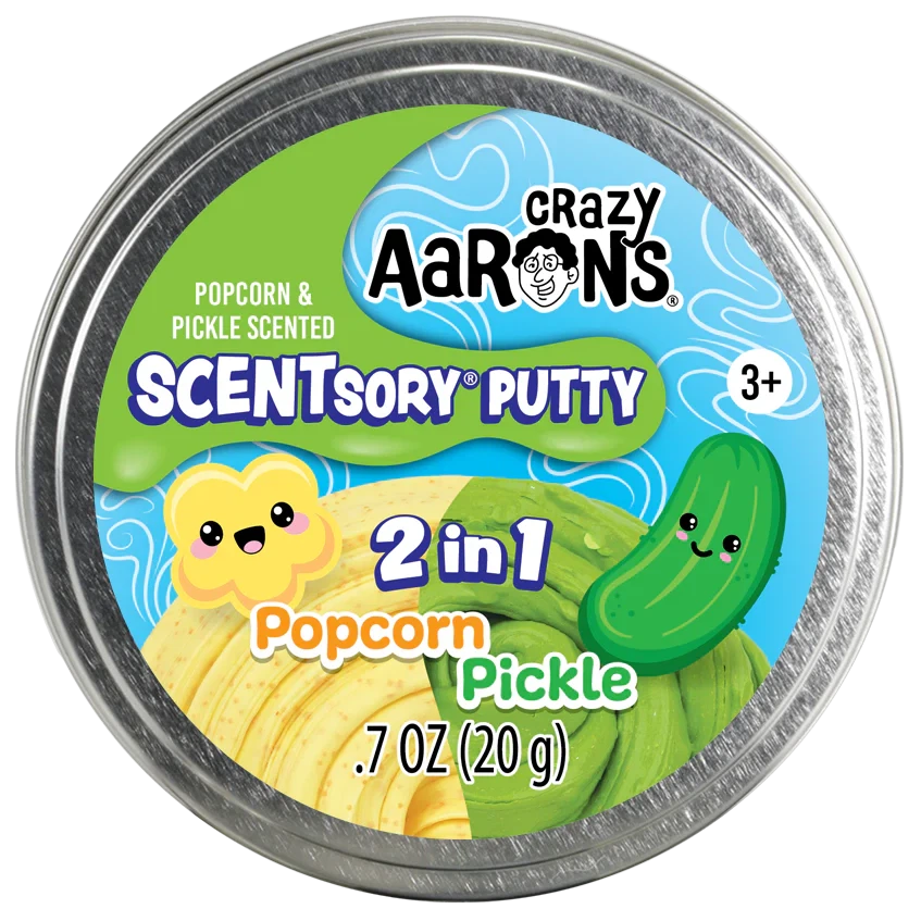 A fun way to double up your putty game. The yellow side infused with a popcorn scent and the green side infused with a pickle scent for the ultimate mashup! 2 in 1 Popcorn and Pickle SCENTsory Putty™ for the craziest, dill-iest, popping good time!