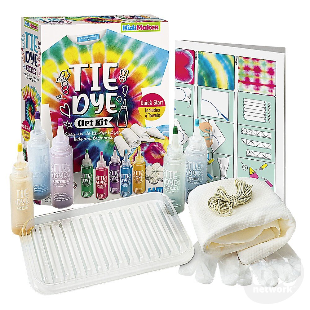 Design and create your own tie-dye projects with this KidzMaker/Tie Dye Art Kit. Includes dye and towels with instructions for creating unique patterns. Great beginner tie-dye kit.