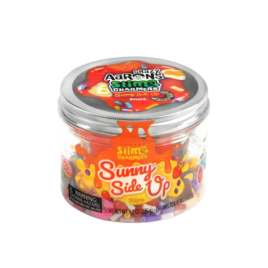 Hear the sizzle and awake the senses with the new Crazy Aaron’s® Slime Charmers™ Sunny Side Up. This classic red slime is filled with all the charms to start your day off right. Go savory with fried eggs or satisfy your need for sweets with a frosted donut or croissant. Mix, pick and flip these colorful charms to create your own egg-cellent experience with Slime Charmers™ Sunny Side Up.
