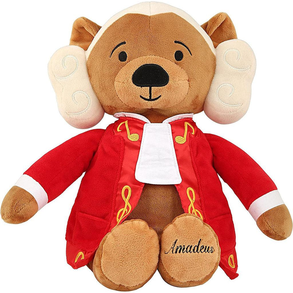 Inspire love for classical tunes & encourage kids to learn musical instrument with this ultra-soft Amadeus Mozart plush bear lookalike. Printed on Amadeus' internal back pocket is a short Mozart autobiography. Charmingly written in the first person, it shares a brief history of the composer’s life as well as the title of each musical selection. Reading the composer’s life story to children before bed time can educate them about the history of music.