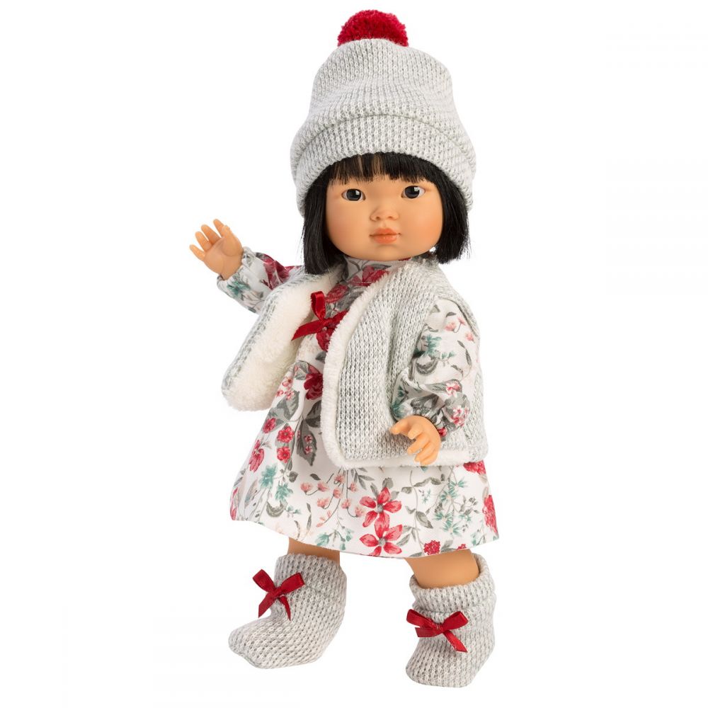 Aja is cute as a button with her beautiful jet black hair, a tiny nose and natural twinkle in the eye! Her complementary outfit includes an adorable white and red floral dress, and a gray fur-lined vest with hat and socks to match. Red details on the hat pom-pom and sock bows tie the whole outfit together! Approximately 15" inches tall.