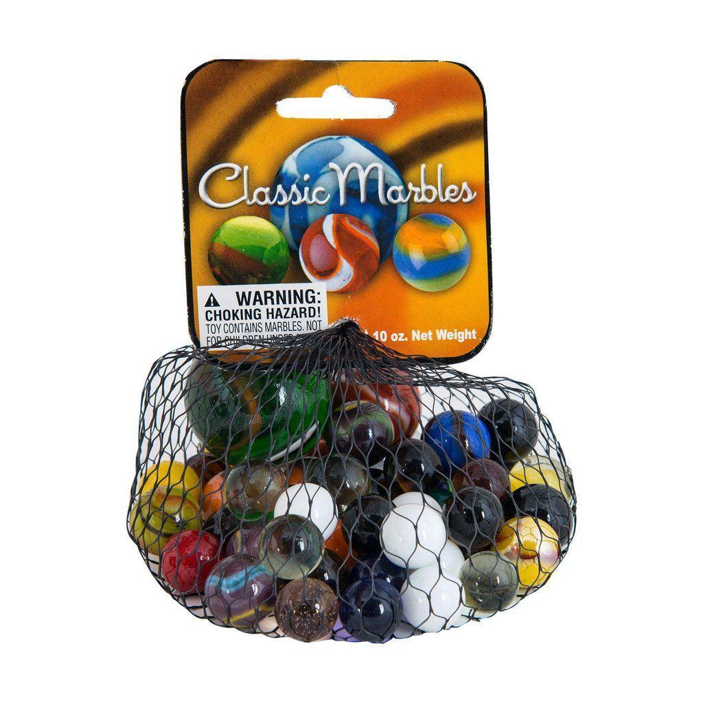 Classic Marble Game set includes a total of 25 premium glass marbles in an assorted variety of colors and styles. Each set includes one shooter which measures 25mm and 24 player marbles which measure 16mm. Game instructions can be found on the header attached to the reusable net bag. This awesome stocking stuffer was created by Mega Marbles and Play Visions. Our Classic Marble Game is a cool gift for your fav sharp shooter!