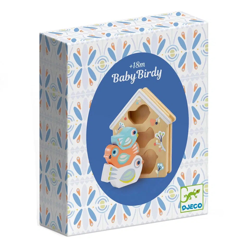 An adorable, painted wooden puzzle that features three stackable birds in a bird house. The wooden house is designed with three slots that match the shape and size of each bird.