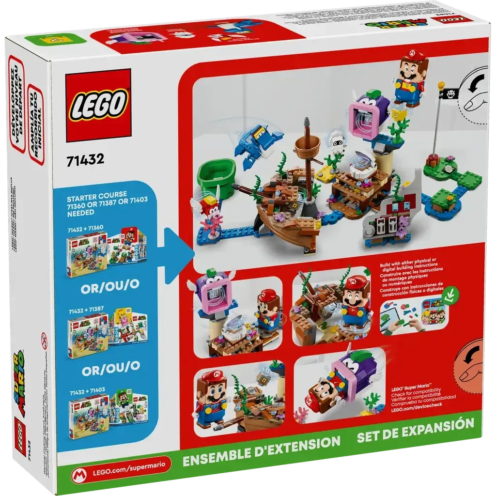 Kids join Super Mario characters and create an exciting LEGO Super Mario underwater level for a treasure hunt with Dorrie's Sunken Shipwreck Adventure Expansion Set (71432). Ride on a Dorrie with an interactive LEGO Mario, LEGO Luigi or LEGO Peach figure (figures not included) and explore the shipwreck. Note: the 71360, 71387 or 71403 Starter Course is required for interactive play.