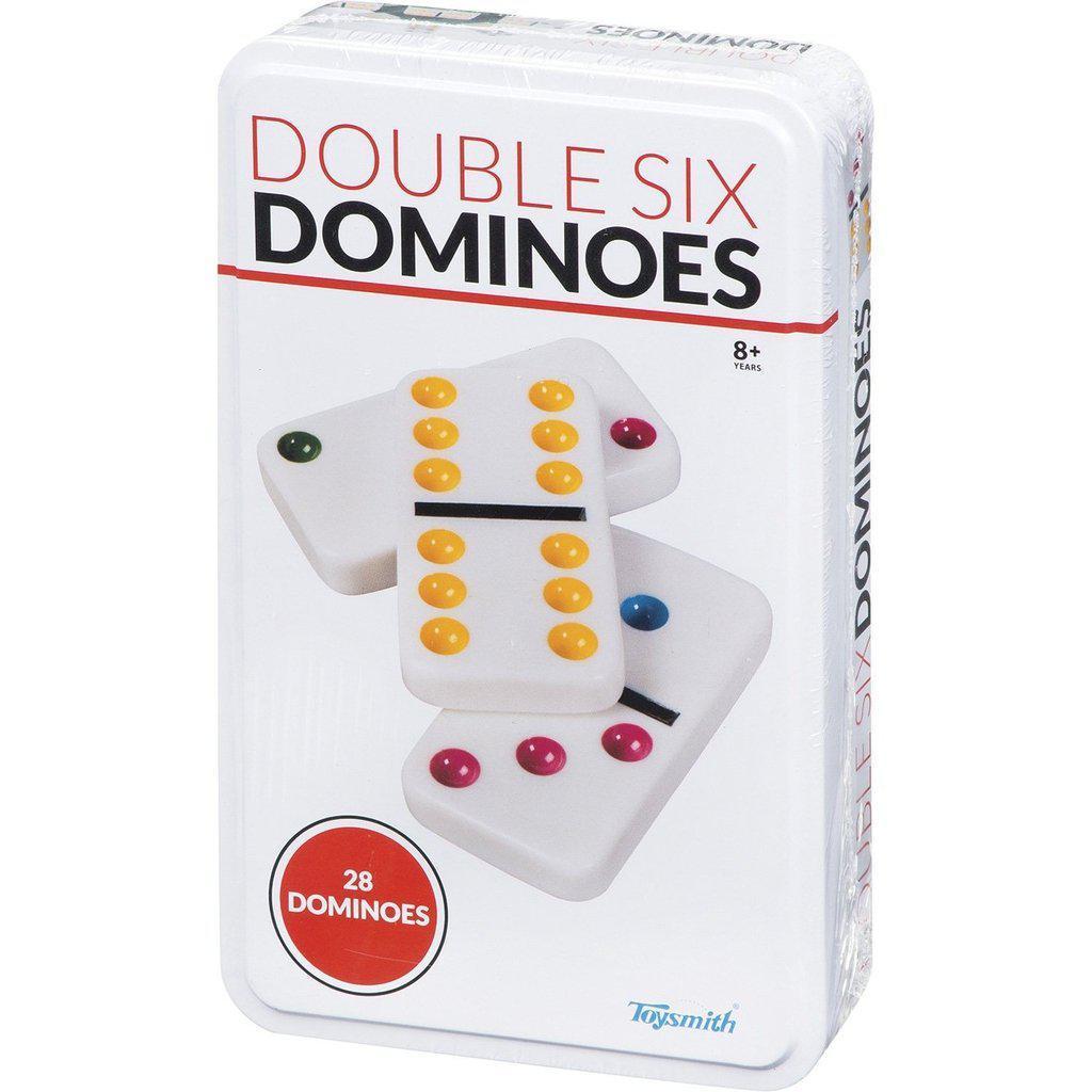 The Toysmith Double 6 Dominoes Set comes with 28 standard sized double six dominoes packed neatly in a sturdy metal storage tin, one plastic Mexican Train starter piece and instructions for a variety of games.