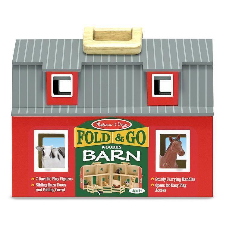 Young MacDonalds will enjoy "down on the farm" fun with this fully assembled, wooden barn. Two-story barn is stocked with seven realistic plastic farm animals, a wooden ladder and a folding corral. Chunky handles let you take your bit of "country" wherever you go!