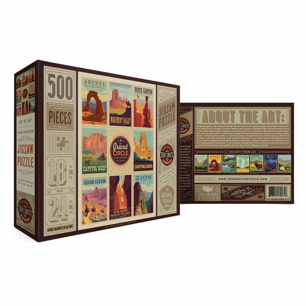 Bringing together the Anderson Design Group’s passion for poster design and outdoor adventure, this collection of vintage-inspired national park posters highlights eight national parks found in the Utah and Arizona segments of the Grand Circle. Located in the American southwest, this tourist route offers a pathway through stunning landscapes and across unique public lands. Connecting five states, 11 national parks, 16 national monuments, and over 20 scenic byways, road trip wanderers and outdoor enthusiasts can find a myriad of adventures as they traverse through the brightly colored rock faces, majestic canyons, vast skylines, and stunning grandeur captured in each poster shared here. Place each piece of this puzzle to enjoy the beauty from the comfort of your own home! Happy puzzling!
