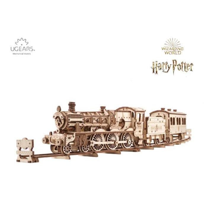 Enter the Wizarding World and join Harry, Hermione and Ron on an exciting journey aboard the HogwartsTM Express with this special working model train by Ugears. Leaving from King's Cross Station in London with destination Hogsmeade Station near Hogwarts Castle, this beautiful wooden model train has a spring-powered locomotive, a coal tender, and a passenger carriage in which three figurines of the young wizarding heroes are seen heading off to school. Wind the model with the special key, twist the smokestack Start/Stop switch, then watch the mesmerizing motion of the locomotive's gears, wheels and connecting rods as it chugs ahead. The Ugears HogwartsTM Express can travel 4 meters (with tender and carriage) or 6 meters (locomotive only) on any smooth, flat surface. This beautiful 3D wooden model train also comes with a section of track and Platform 9 ¾ buffer stop for an elegant static display.