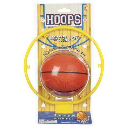 Big Hoops basketball set includes an 8 inch diameter plastic rim with a net and a 5 inch rubber basketball.Great for all ages, this wall-mountable miniature basketball hoop is an unmatchable way to relieve boredom at home or in the office. Play hours of PIG or other classic basketball shooting games with this indoor/outdoor backboard.