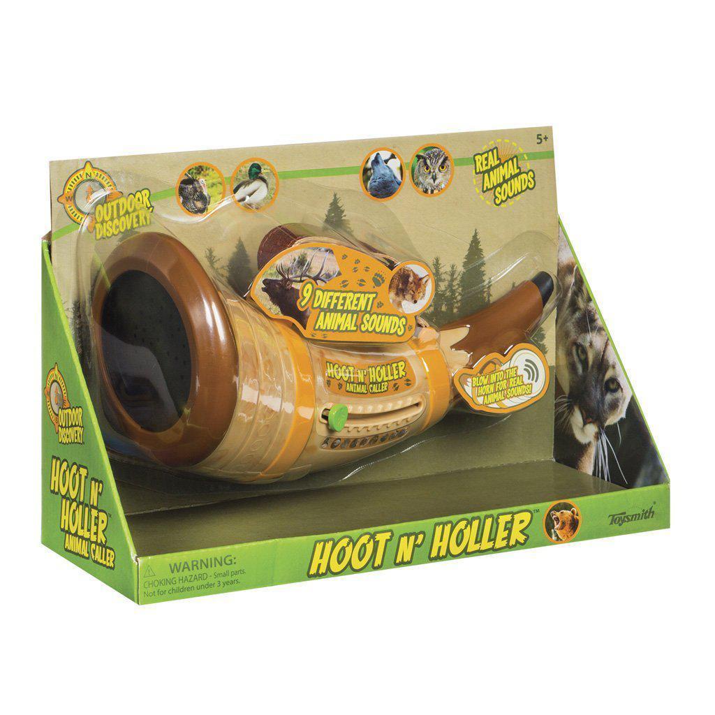 Blow into the 9" horn to make it roar, bellow, and howl! Adjust dial for up to nine different animal calls. Includes hand strap and animal details. 3 AA batteries included.