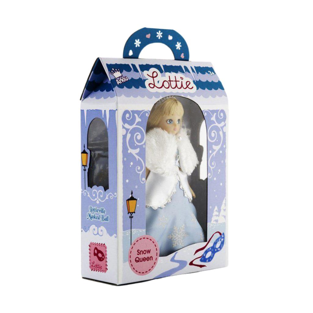 Lottie is off to a masked ball! She comes with a silver sparkly mask, magnificent ice blue and frosty white gown, furry wrap, a pair of blue slippers, evening bag, and a sparkly crown. Lottie is 7" tall. Measures 6.37 x 2.37 x 10.5 in box.
