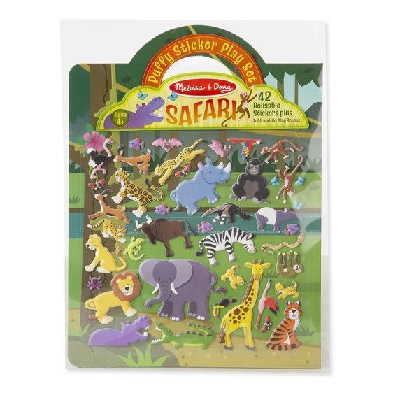 Enjoy endless animal adventures with dozens of wild creatures! This reusable puffy sticker set includes a sturdy double-sided, fold-out background panel, plus 42 puffy stickers. Use the stickers to fill savannah or jungle scene with big cats, birds, elephants, hippos, and more. Easy to place, layer, and re position, the reusable stickers make it easy to tell a story of safari adventure. Simply place the puffy stickers on the board, then change the picture whenever you're ready to change the story! The built-in sticker collection offers endless opportunities for kids to express their creativity, all while improving fine motor skills and communication. A die-cut handle and fold-and-go format make this kids' sticker activity set great for travel, too!