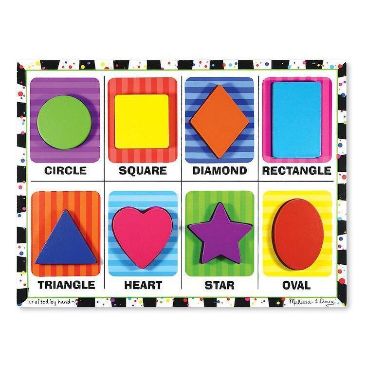 Eight familiar shapes are featured in this extra-thick wooden puzzle with easy-grasp, chunky pieces. Each piece has a matching picture underneath and the shape name is printed on the puzzle board. Encourages hand-eye coordination, fine motor skills and visual perception skills.