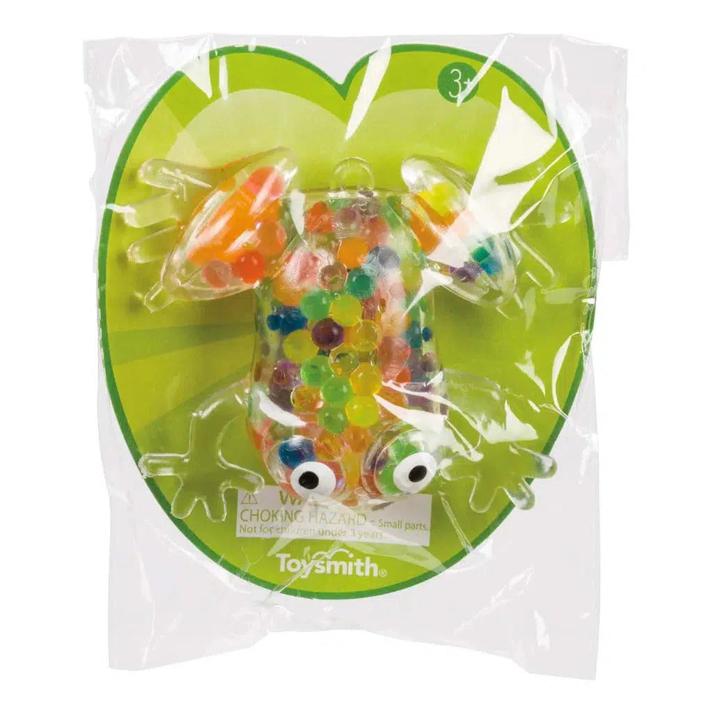 Colorful, squishy beads fill this translucent frog squish toy. Beads come in red, pink, yellow, orange, green, blue, and purple. When the frog is compressed, the soft beads shift and move for a gooey squeeze effect. Its body is made of translucent plastic that’s soft yet durable enough for squishing and squeezing. Its body also has a slightly sticky texture that makes this frog more realistic.