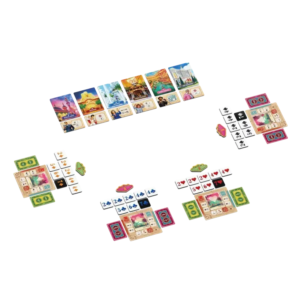 In this 2-6 player bluffing game, players have hidden information about which casinos are corrupt. Take turns playing betting tiles (three 2’s, two 4’s, one 5, one 6, one 7) into the different casinos.