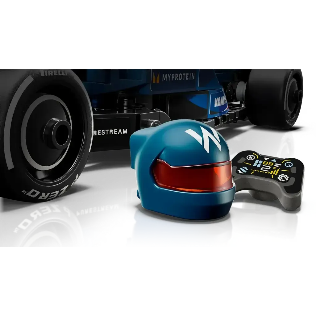 The F1 model car features a cockpit that opens by lifting the halo bar, a rear wing, wishbone suspension, sponsor stickers and wider rear tires imprinted with “Pirelli.” The buildable F1 toy car also comes with a driver minifigure wearing a Williams Racing outfit and a winged helmet to place inside the cockpit.